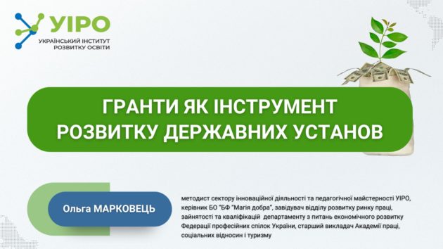 23 січня 2026 року в Українському інституті розвитку освіти відбувся вебінар «Гранти як інструмент розвитку державних установ», під час якого керівники підрозділів опрацювали алгоритми залучення грантових ресурсів для модернізації освітньої інфраструктури, цифровізації та професійного розвитку педагогічних працівників. Спікером заходу виступила Ольга Марковець — методист сектору інноваційної діяльності та педагогічної майстерності УІРО, керівник БО «БФ «Магія добра» та досвідчена тренерка з грантрайтингу.
