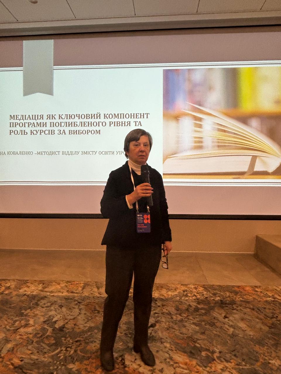 Окремий блок програми був присвячений актуальним викликам сучасної школи. Методист УІРО Оксана Коваленко у своїй презентації розкрила роль медіації як ключової компетентності у стандартах старшої профільної школи.